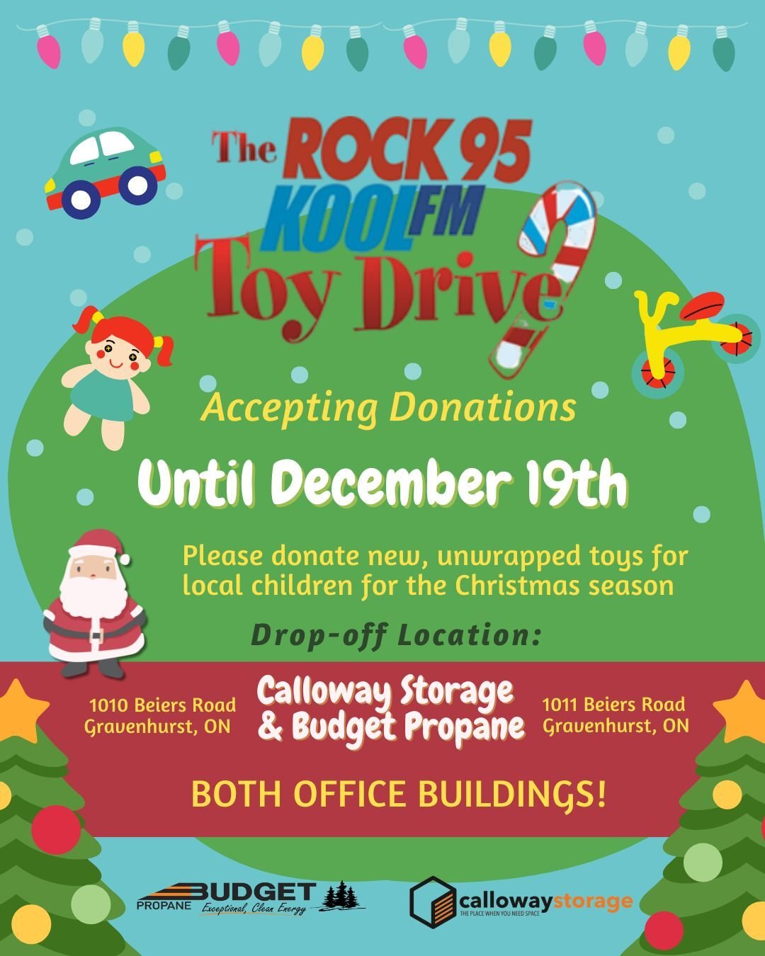 It’s that time of year when we turn our attention not just to keeping homes warm with propane, but to keeping hearts warmed with generosity, kindness and the spirit of giving. At Budget Propane, along side Calloway Storage, we are thrilled to announce that we are an official drop-off location for the 35th annual Rock 95 / Kool FM Toy Drive, and proud to serve as the furthest-north drop-off point for the initiative, making us your go-to place in the Muskoka, Haliburton and surrounding northern Ontario communities.