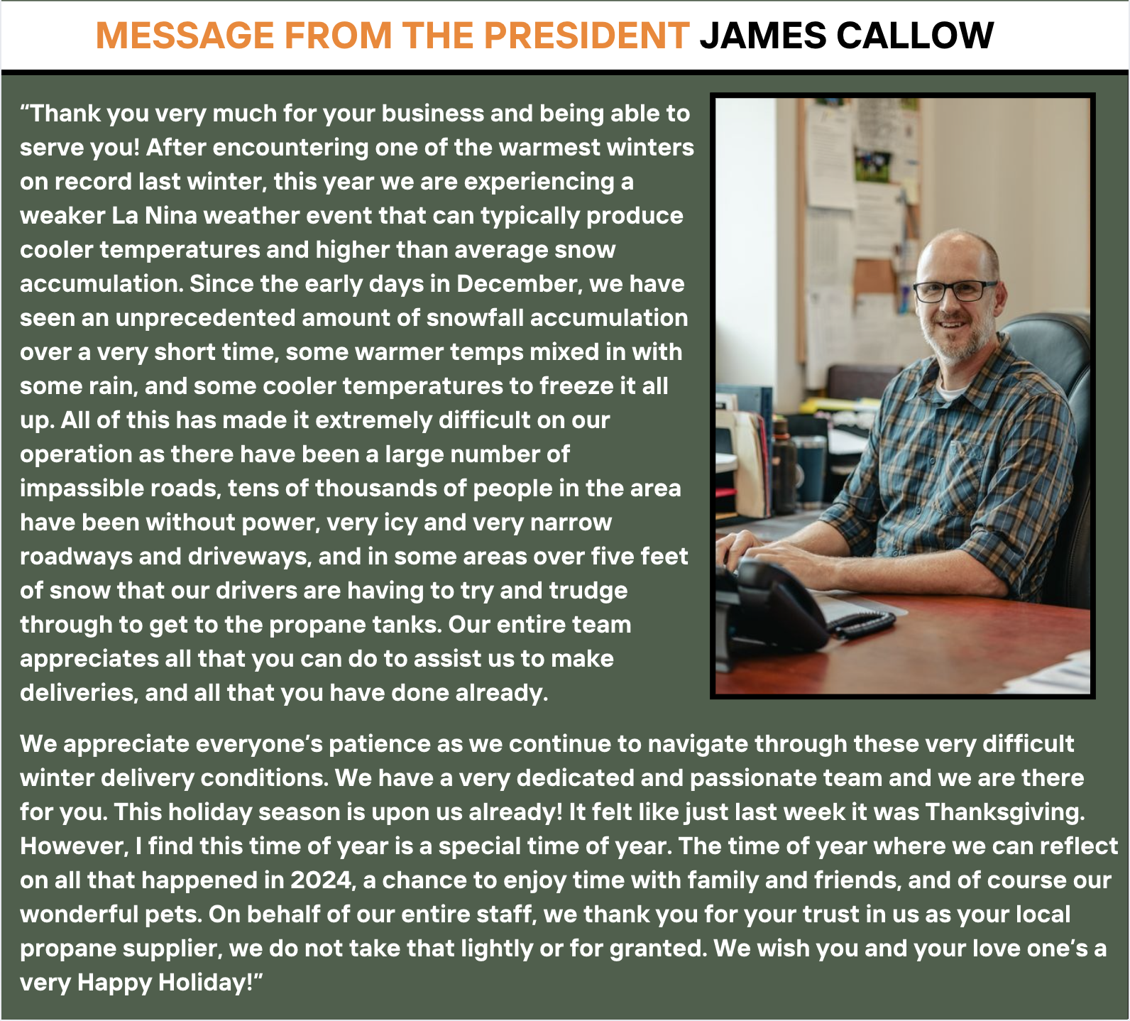 We are asking for your assistance by ensuring your roads and driveways are plowed and sanded. We also ask for a pathway that is cleared to the tank and that the tank be cleared of any snow, as it is greatly appreciated by our delivery drivers.